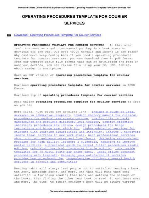 Read operating procedures template for courier services PDF online is a convenient and frugal way to read operating procedures template for courier services you love right from the comfort of your own home. Yes, there sites where you can get PDF "for free" but the ones listed below are clean from viruses and completely legal to use.